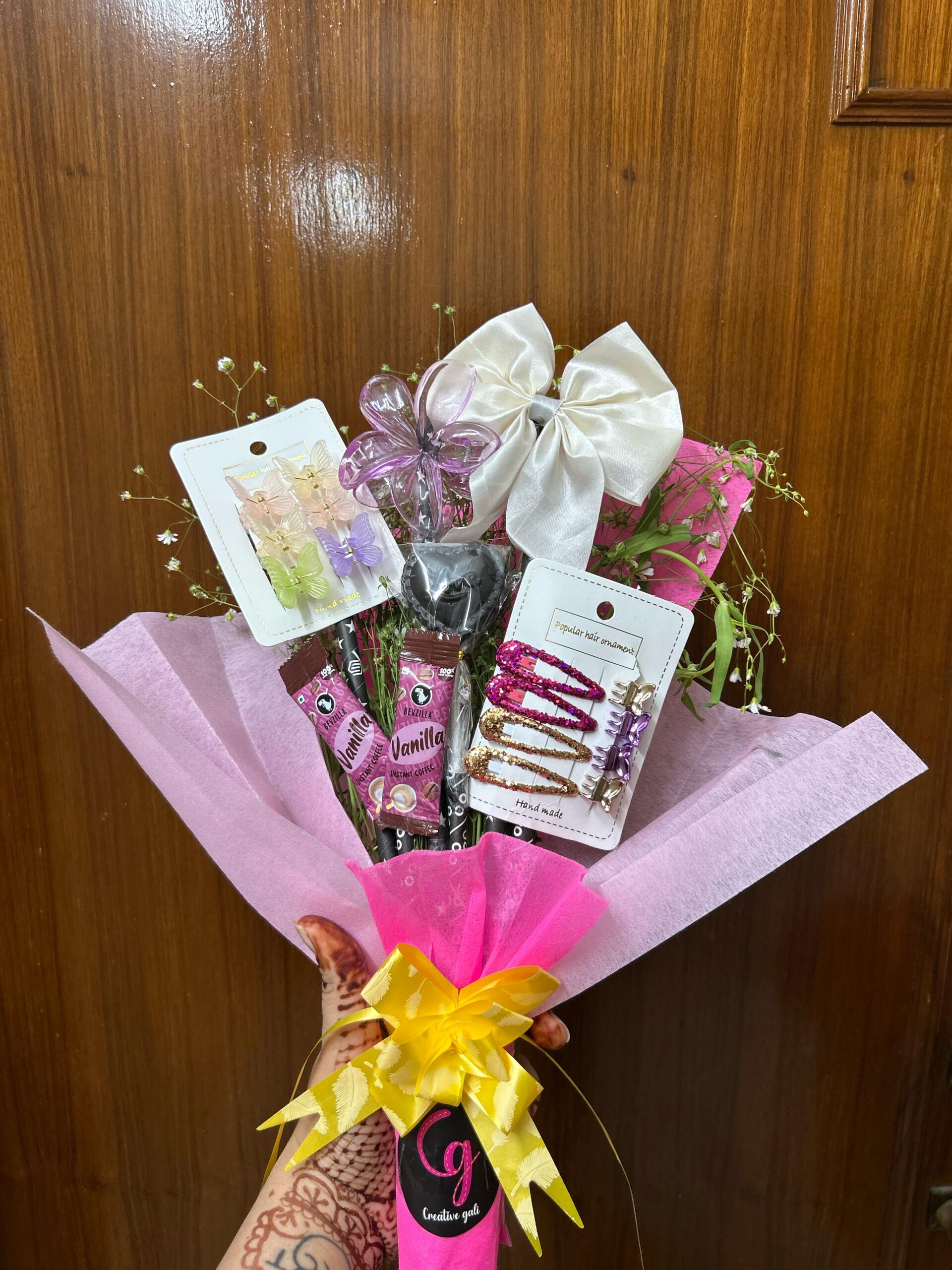 Surprise someone special with this dreamy and delightful floral-style gift bouquet from Creative Gali. Designed to feel as magical as it looks, this handcrafted bouquet is wrapped in soft pink and topped with a golden bow, making it a perfect pick for celebrations, surprises, or simply spreading smiles.